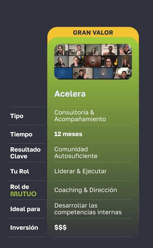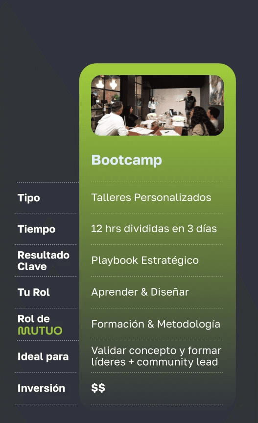 Entonces probablemente necesitas un Bootcamp o el Programa Acelera. Trabajamos con organizaciones que ya tienen comunidades y quieren reactivarlas, escalarlas o monetizarlas. Los resultados se ven desde las primeras semanas.