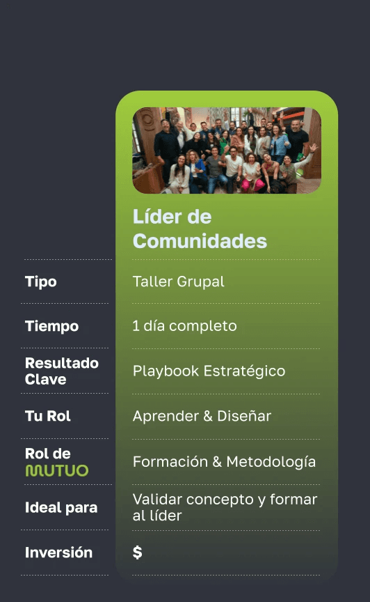 1. La Comunidad de Líderes de Comunidad más potente de Iberoamérica, donde founders, líderes y community leads comparten experiencia y mejores prácticas (gratuita, por aplicación). 2. El Taller Líder de Comunidades: un día intensivo presencial donde te llevas el mapa estratégico completo para diseñar, activar y monetizar tu comunidad con nuestra metodología CMV®. 3. Bootcamp para organizaciones: inmersión de 3 días con tu equipo para diseñar la estrategia de comunidad de tu empresa. 4. Programa Acelera: acompañamiento de 12 meses donde operamos hombro con hombro durante 3 meses y te dejamos volando solo con seguimiento semanal los 9 restantes. 5. Community as a Service: nos convertimos en tu departamento de comunidad externo.